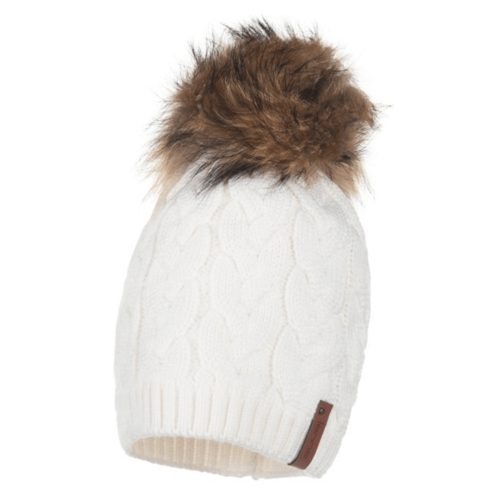 Плотное прилегание шапки к голове обеспечивает двойная вязаная резинка. Головной убор украшает узор "жгут", помпон из искусственного меха.