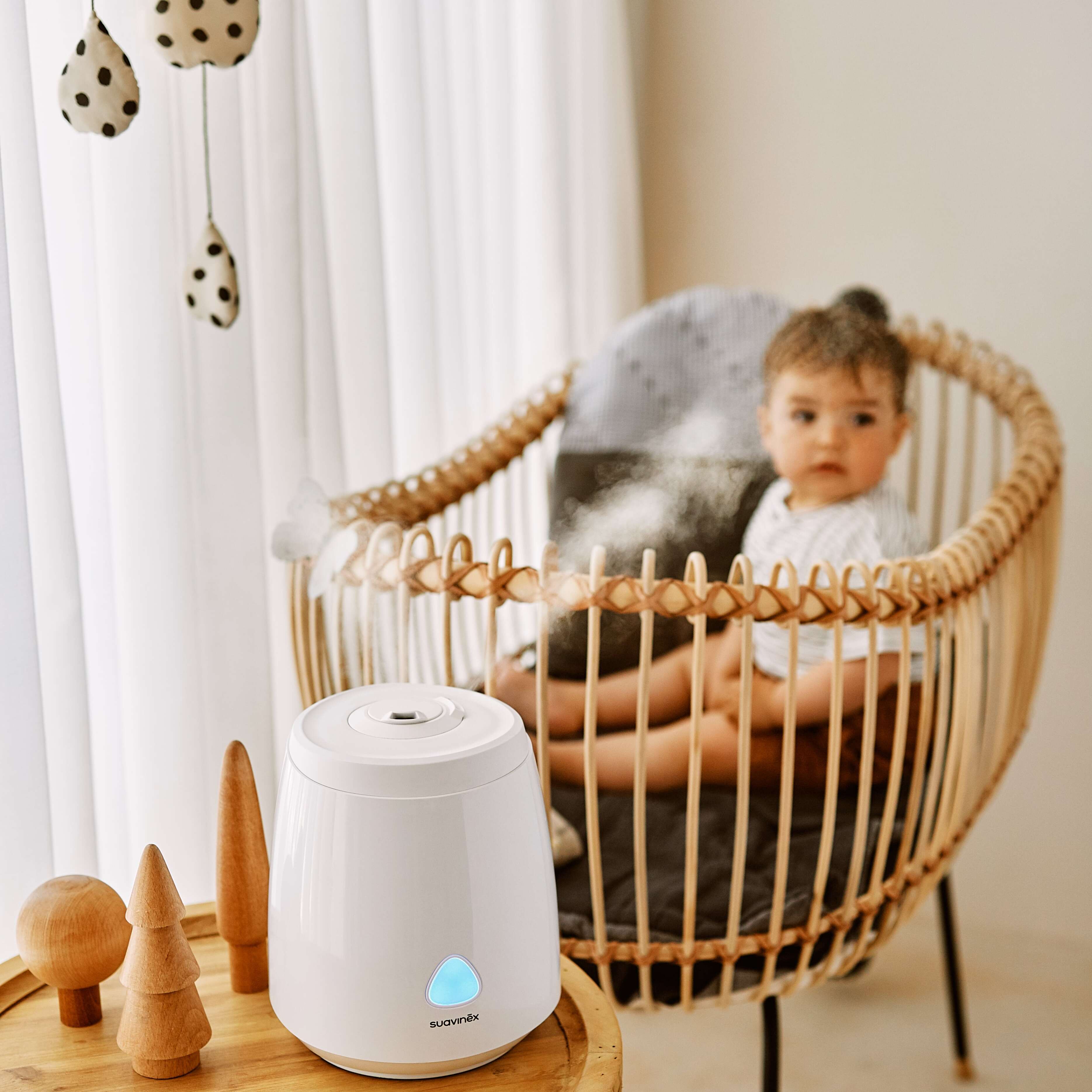Увлажнитель воздуха Suavinex SMART – идеальное решение для поддержания комфортной влажности в детской комнате. Благодаря встроенным датчикам вы можете контролировать уровень влажности и температуру в помещении в режиме реального времени через мобильное приложение Suavinex Link.