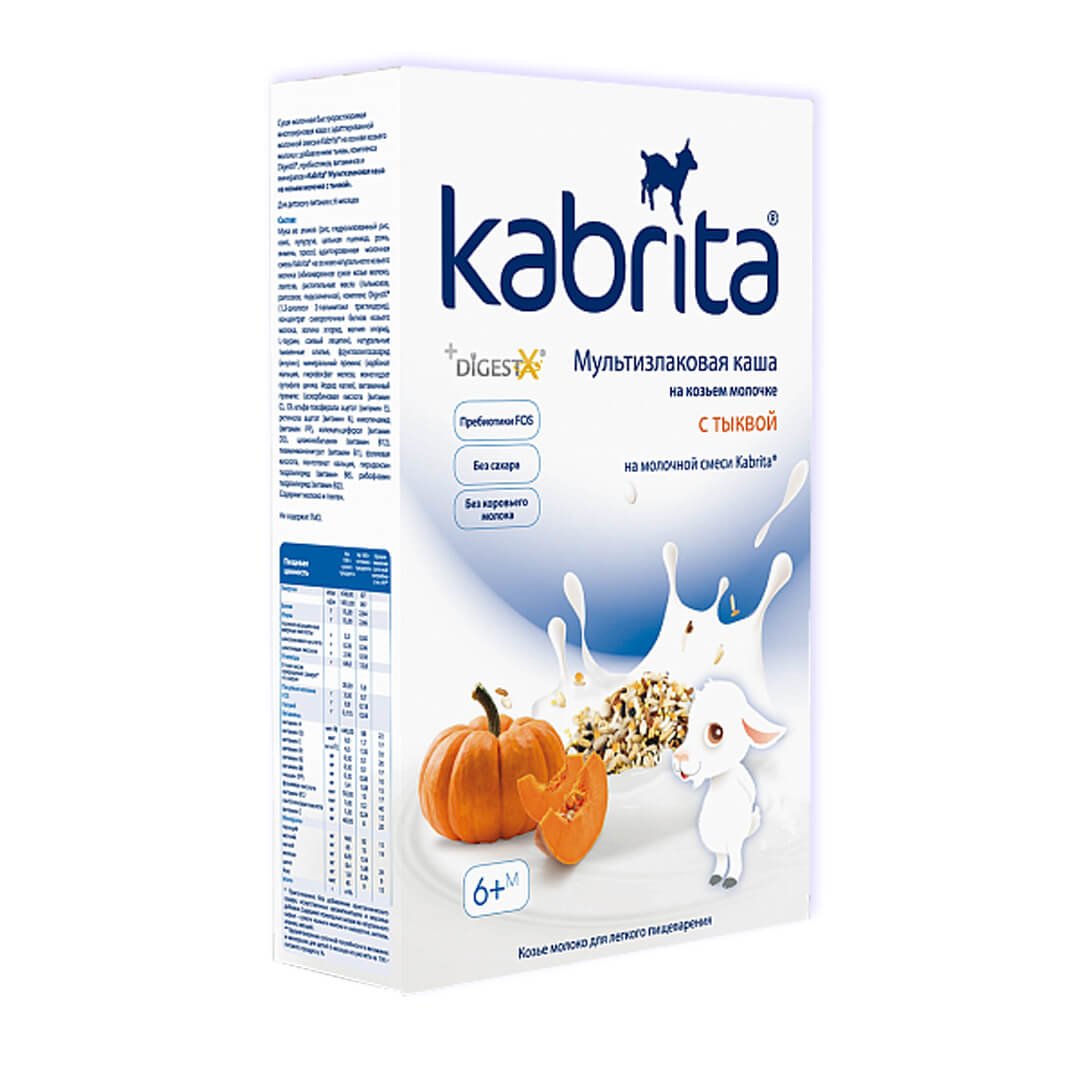 Сухая молочная быстрорастворимая каша с добавлением тыквы, комплекса DigestX, пребиотиков, витаминов и минералов. Подходит для питания детей в возрасте от 6 месяцев - для расширения меню и развития вкусовых привычек. В основе мультизлаковой каши - адаптированная смесь Kabrita на натуральном козьем молоке для комфортного пищеварения. DigestX - комплекс жиров с бета-пальмитатом, подобный жировому профилю грудного молока, способствует снижению вероятности запоров, лучшему энергообмену и усвоению кальция. Пребиотики способствуют улучшению пищеварения и укреплению иммунитета. Без сахара. Артикул 797547.