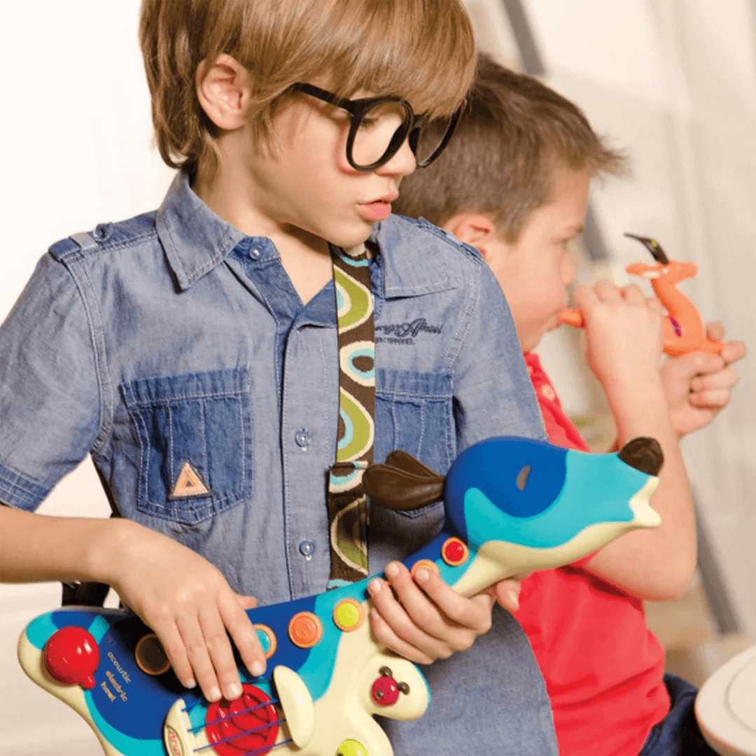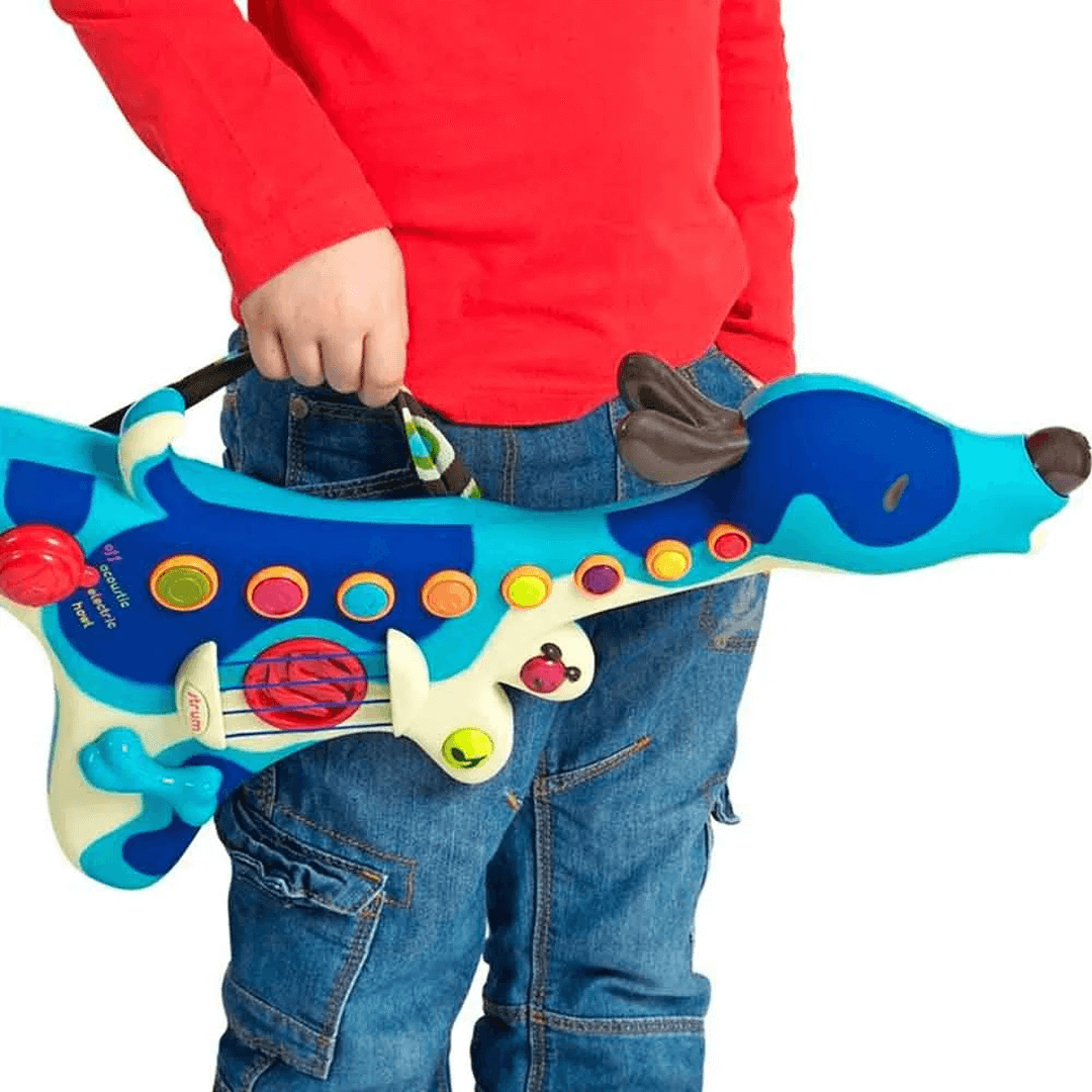 Сыграй крутые гитарные импровизации со своим верным другом. Выбери настроение! У детской гитары в виде пса 3 режима игры: акустический, электро и режим лая. Есть 8 музыкальных кнопок с аккордами от С до С. Струны гитары играют последовательности аккордов или запрограммированные композиции - 20 мелодий и 9 забавных собачьих песенок. Волшебная косточка придаст спецэффекты любой твоей песне. Громкость можно регулировать. В комплекте есть буклет. Настроено автоотключение через 2 минуты. Игрушка помогает развить музыкальный слух у ребенка, креативность, воображение. Размер - 24 х 9,5 х 46 см. Питается от 3 батареек АА, входящих в комплект. Рекомендуемый возраст - от 2 до 6 лет.