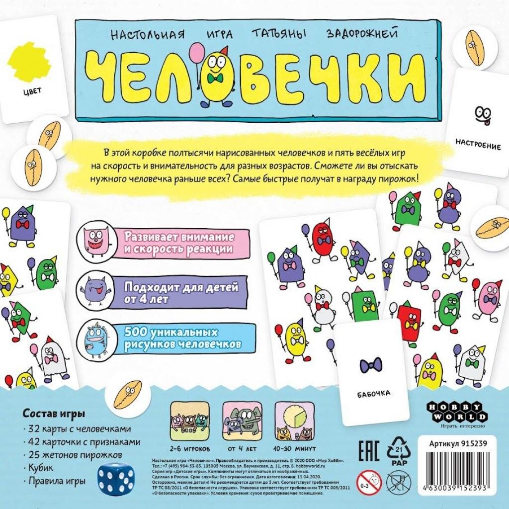 В этой коробке полтысячи нарисованных человечков и пять весёлых игр на скорость и внимательность для разных возрастов. Сможете ли вы отыскать нужного человечка раньше всех? Самые быстрые получат в награду пирожок!