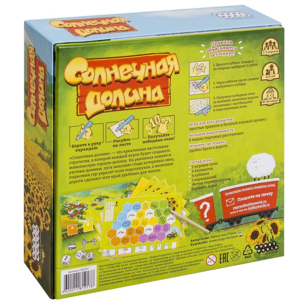 «Солнечная долина» — это креативная настольная стратегия, в которой каждый игрок будет создавать живописную горную долину. На равнинах появятся уютные домики, луга заполнят стада кучерявых овец, подножия гор украсят поля подсолнухов, а железные дороги сделают этот край удобным для жизни.