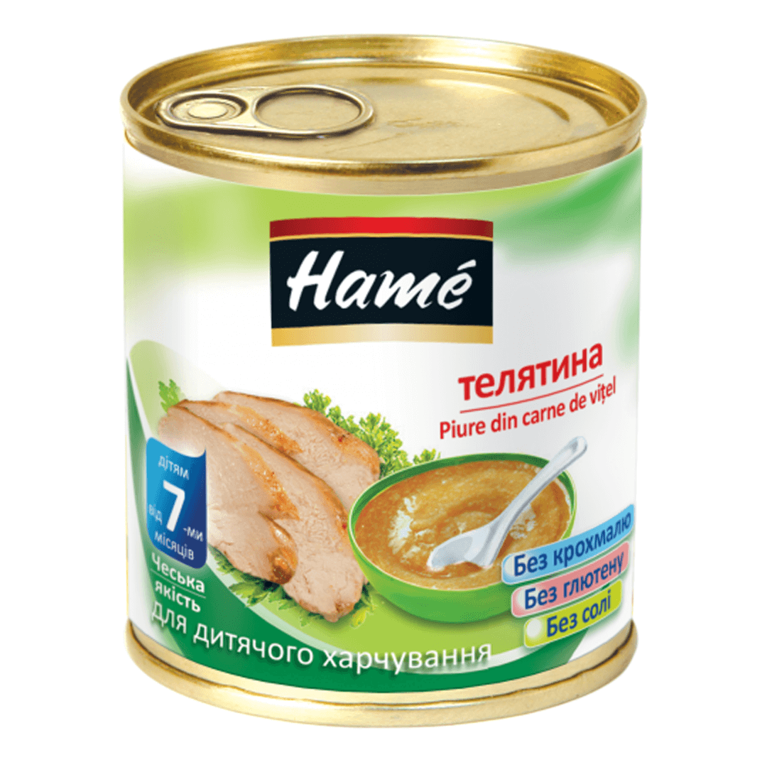 Пюре "Телятина" - консерва на мясной основе для детского питания. Гомогенизированный, стерилизованный, готовый к употреблению продукт, предназначенный в качестве прикорма младенцам в возрасте от 7 месяцев. Не содержит глютена, сахара, консервантов, красителей, ароматизаторов, соли. Без ГМО. Состав: мясо телячье (33,6%), вода питьевая, мука рисовая, масло растительное подсолнечное рафинированное.