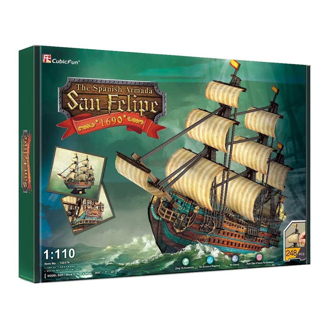 Проведите время в кругу семьи, составляя головоломку от CubicFun. В комплект входят 248 деталей, из которых можно собрать парусник - точную копию величественного испанского галеона 17 века "Сан Фелипе". В сложенном виде модель корабля достигает 68 x 18 x 56 см. Имеет масштаб 1: 110 к оригиналу. Детали головоломки сделаны из ламинированного пенокартона. Соединяются между собой без дополнительных средств - по принципу пазлов. Готовый корабль крепкий - им можно играть. 3D пазл рекомендован детям от 5 лет. Развивает мелкую моторику, внимание к деталям, логическое мышление, усидчивость, концентрацию. Артикул 123652.