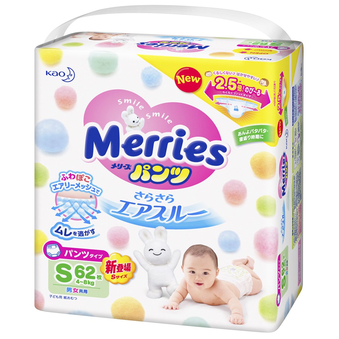 Подгузники в виде трусиков для подвижных малышей от японского бренда Merries имеют ряд преимуществ. Их так легко менять. Они не пережимают живот и не мешают движению. Хорошо сидят по фигуре. Благодаря волнистой, очень мягкой поверхности слоя с пористой структурой подгузник отлично пропускает воздух. Влага выводится через многочисленные поры внутренней поверхности. Но воздушные микроканалы пропускают только пот - ничего больше! Мочу надежно удерживают мелкие ячейки, расположенные по бокам волнистого слоя. Жидкий стул быстро поглощают большие ячейки, расположенные по центру. Итак, никаких протеканий не будет! Полимер, используемый при производстве подгузников Мериес, способен впитывать объем жидкости, который в 200-300 раз превышает его собственный. У обновленных трусиков плотно прилегающие мягкие оборочки тянутся в 2,5 раза лучше.