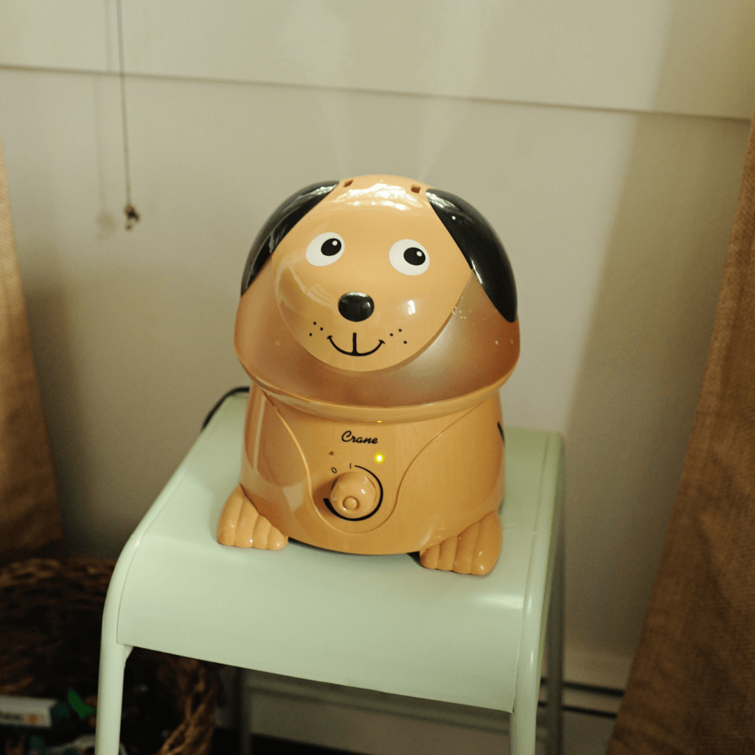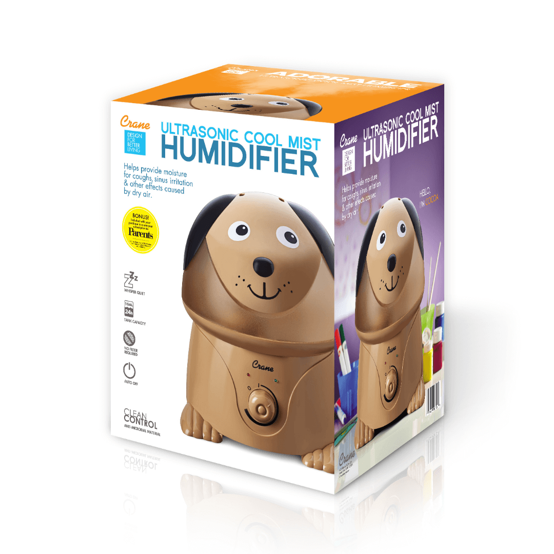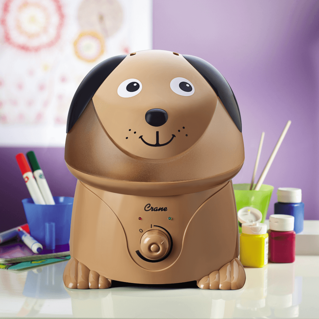 Увлажнитель воздуха в виде собаки от Crane будет оберегать ребенка, когда он в помещении. Устройство обезвреживает бытовые аллергены: пыльцу домашних растений, перхоть животных, частицы пылевых клещей. Поддерживает оптимальный уровень влажности - 40-60%. Как работает прибор? В бак объемом 3,78 л наливают воду и включают увлажнитель. Из макушки головы щенка идет водяной пар, интенсивность подачи которого можно регулировать. Прибор имеет индикаторы. Этот коричневый пес органично впишется в интерьер детской комнаты. Не ставьте прибор на пол, у деревянных и бумажных предметов. Корпус сделан из пластика и полипропилена. В составе материалов нет бисфенола А и фталатов. Прибор рассчитан на площадь до 23 кв. м. Расход воды на увлажнение составляет 8,7 л в сутки. Уровень шума - 37 дБА. Размеры увлажнителя - 23 х 23 х 32 см. Имеет антибактериальное покрытие.